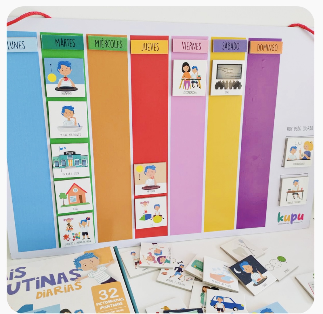 32 pictogramas imantados con rutinas diarias 5×5 cm. (Desayuno, almuerzo, merienda, cena, dormir, despertarse, escuela/jardín, doctor, fonoaudióloga, psicopedagoga, T.O, psicóloga, me lavo las manos, casa, me baño, compras, plaza, dentista, juegos electrónicos, juguetes/juegos de mesa, ir al baño, trabajo/estudio, leer, música, deporte/ejercicio, me lavo los dientes, jugamos con amigos, cine, paseo en auto, ahora, después, cumpleaños. Más los 7 días de la semana)