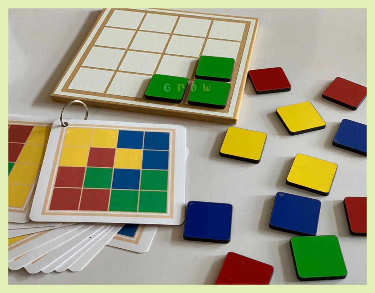Tablero de madera de 14×14 cm. 16 fichas de madera de diferentes colores. 12 tarjetas con patrones.